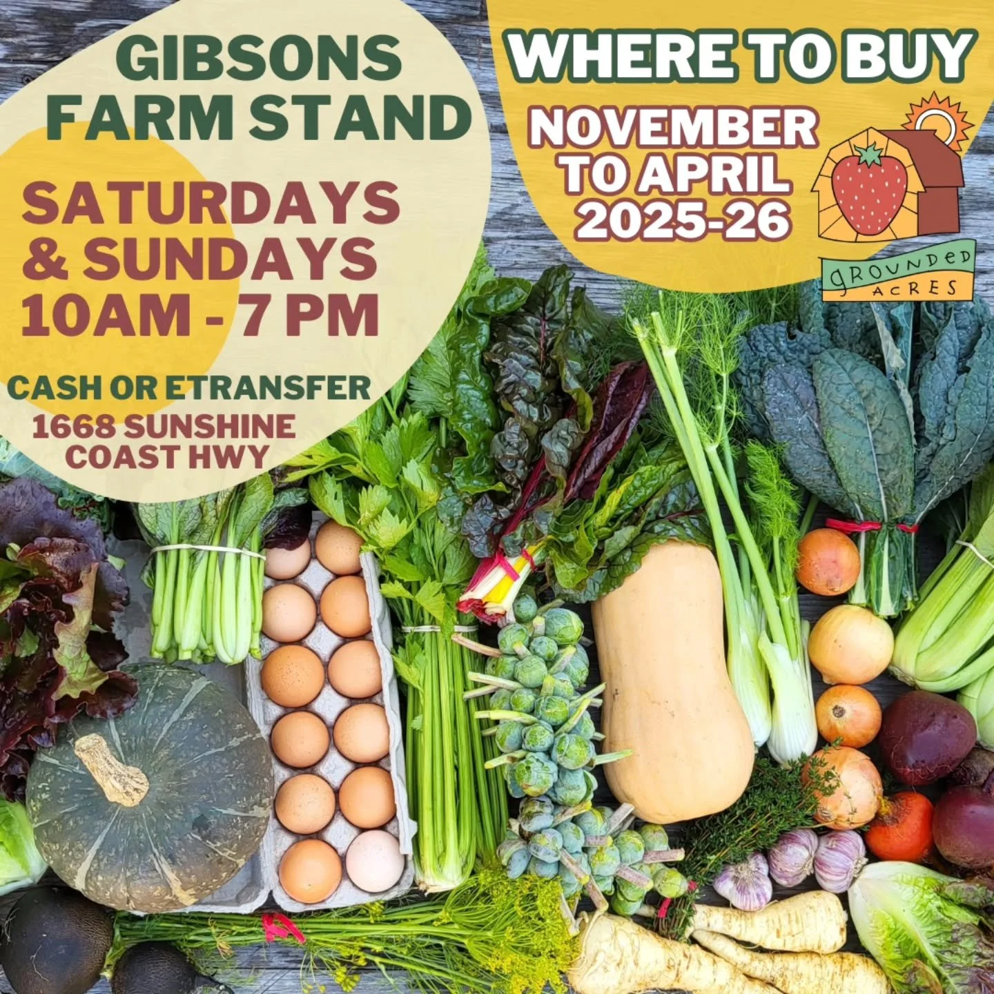 Farm StandFind our produce and eggs at the stand on our farm at 1668 Sunshine Coast Highway in Gibsons. May 2 - October 27, 2025: open Fridays, Saturdays, Sundays and Mondays 10AM-7PM. November 1, 2025 - April 6, 2026: open Saturdays and Sundays 10AM-7PM. Open all year, including holidays. You can pay by cash or e-transfer. You’ll find a wide variety of our produce, eggs, seedlings and seeds reflecting what is seasonally available on the farm. On-site parking available.